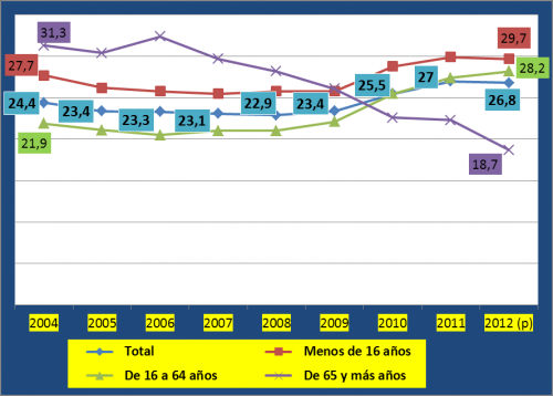 El porcentaje de la población total en riesgo de pobreza había disminuido ligeramente desde el año 2004 (24,4%) al 2008 (22,9%). Pero se incrementa fuertemente (cuatro puntos, el 17%) en estos cuatro años, hasta llegar al 27% en 2011 y al 26,9% (provisional), en 2012. Así, por debajo de ese umbral se sitúa más de una cuarta parte (26,8%) de la población española, o sea, casi doce millones de personas. Paradójicamente, la parte de los habitantes que resiste más este retroceso es la de 65 y más años, ya que sus pensiones de jubilación (no las de viudedad) son mayoritariamente bajas pero están ligeramente por encima de ese umbral (aunque van a sufrir los recortes de las reformas de pensiones aprobadas, e hijos y nietos empiezan a depender de esos ingresos). Al mismo tiempo, en la población adulta se incrementa la pobreza al aumentar el desempleo, y su tasa de pobreza corre pareja con la de la media. Es especialmente significativo el aumento del porcentaje de pobreza, en más de seis puntos (del 21,9% al 28,2%), entre la población menor de 16 años, gran parte en unidades monoparentales (mujeres en desempleo o inactivas), y que presenta un panorama muy difícil para una parte significativa de nuestra infancia.